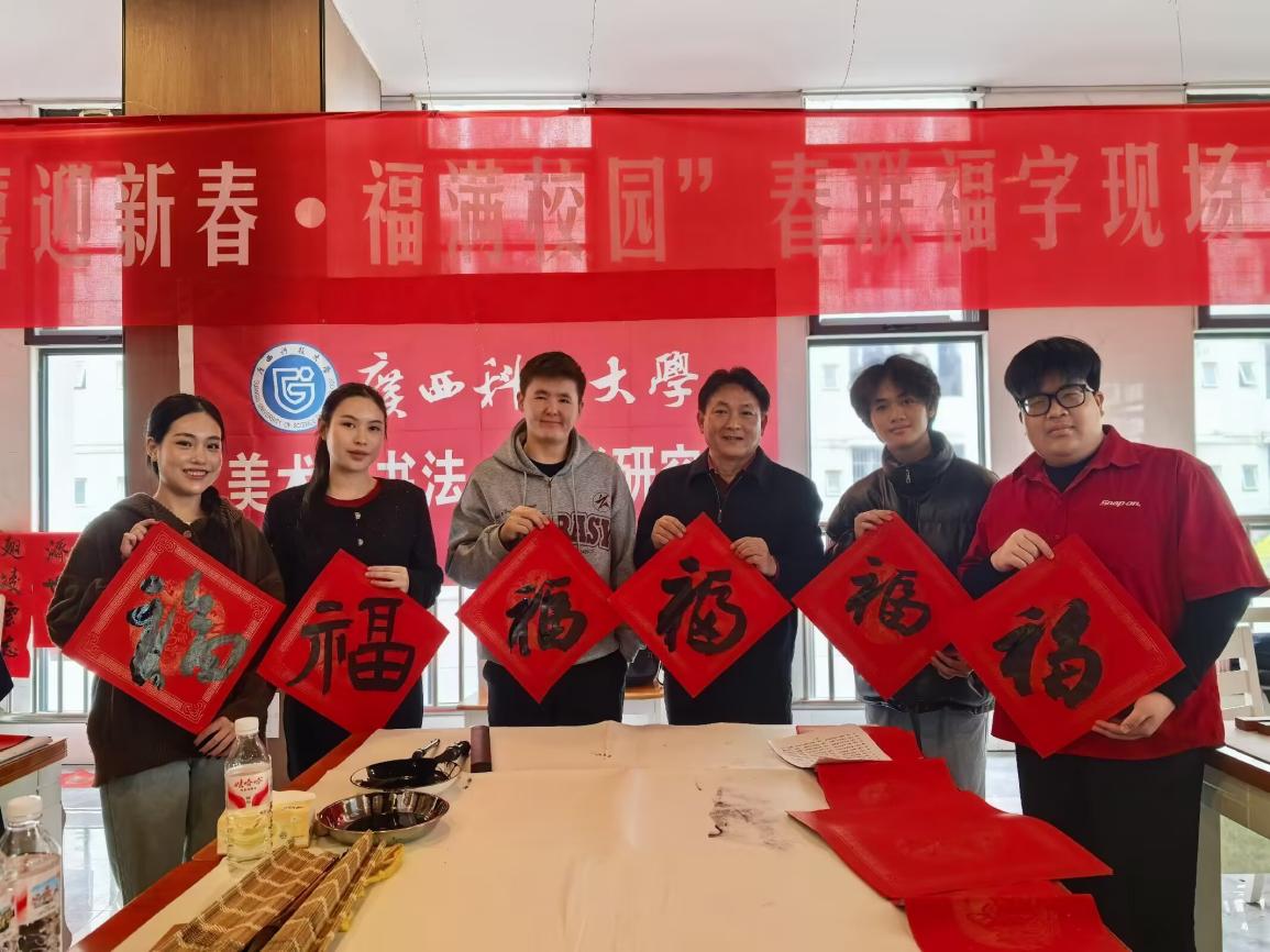 活动现场悬挂着大红灯笼和红色中国结,洋溢着浓浓的中国春节气氛。学校特别邀请了广西书法家协会的专家和学校书法研习会的成员进行指导。老师们首先向国际学生介绍了春联和“福”字在中国文化中的深厚内涵,示范了毛笔的正确握姿和运笔方法。国际学生对毛笔表现出浓厚兴趣,在老师的悉心指导下,每个学生都全神贯注,一丝不苟地完成自己的作品。