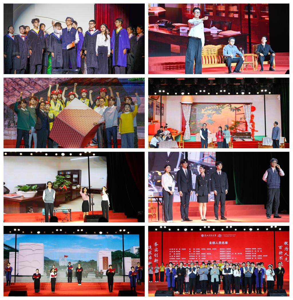 校史剧《薪火》以学校厚重历史为底色,通过艺术化手法生动再现了发展历程中的关键节点与感人故事。全剧以柳教授的深情回忆徐徐展开,串联起“武汉求贤”“建设热潮”“考研扶学”“并肩融合”“评估攻坚”等5个代表性场景,让这些珍贵的历史瞬间在舞台上焕发新生。剧中塑造的教师群像,正是广西科大多年来爱岗敬业、甘于奉献的教职员工的真实缩影,让观众得以见证一代代广西科大人如何在这片热土上扎根奋斗、薪火相传,以智慧与汗水共同浇筑起教育事业的巍峨大厦。该剧由学校团委精心策划,师生自编自演,历经1个多月的创作打磨,最终呈现出一台思想性、艺术性俱佳的作品。