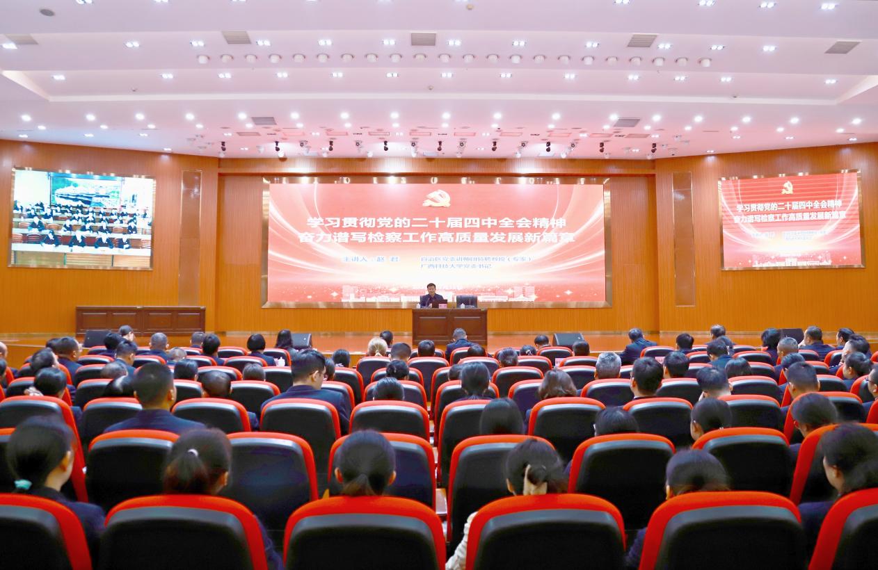 根据自治区党委的决策部署和自治区党委宣传部的统一安排,12月11日下午,自治区党委讲师团特聘教授(专家)、自治区第十二次党代表大会代表、学校党委书记赵君到柳州市检察院系统宣讲党的二十届四中全会精神。报告会由柳州市检察院党组书记、检察长方雷主持。柳州市检察院主会场、县区分会场500余名干部参加报告会。