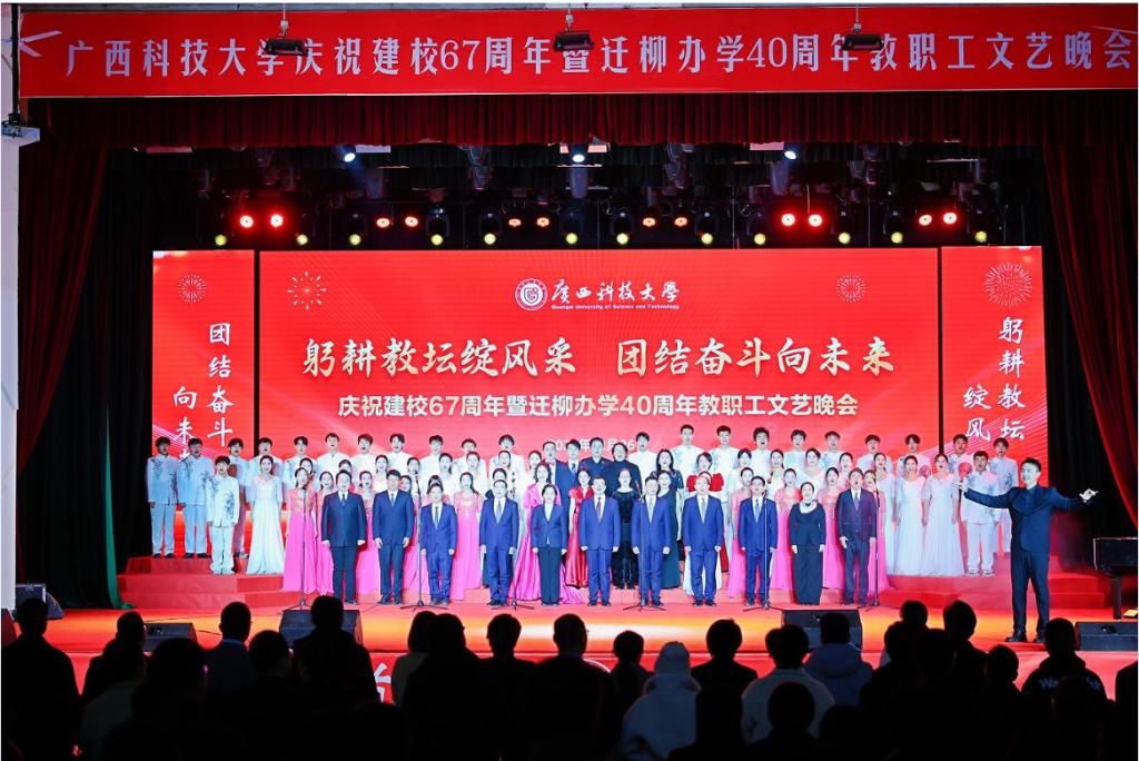 灯火璀璨映初心,歌声嘹亮颂华章。12月26日晚,广西科技大学文昌校区大礼堂内掌声雷动、暖意融融。学校以“躬耕教坛绽风采 团结奋斗向未来”为主题举办庆祝建校67周年暨迁柳办学40周年教职工文艺晚会。全体在家校领导、柳州市总工会相关领导与现场1000余名师生齐聚一堂,线上1万余名观众同步云端守望,共赴一场光影交织的文艺盛宴。