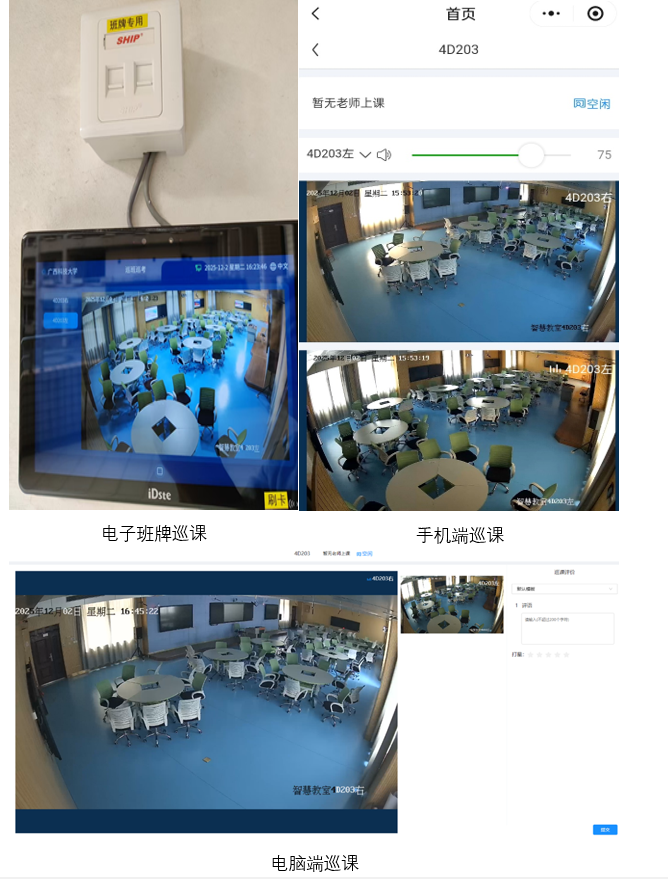 在管理端,智慧教室的管理效能也实现了质的飞跃。管理人员可通过电脑端、手机端以及教室外的电子班牌三种渠道,实时开展巡课工作。通过远程可视化界面,管理人员能够清晰掌握各智慧教室的设备运行状态、教师使用情况等信息,实现对智慧教室的全方位、立体化管理,为教学保障工作提供了坚实支撑。
