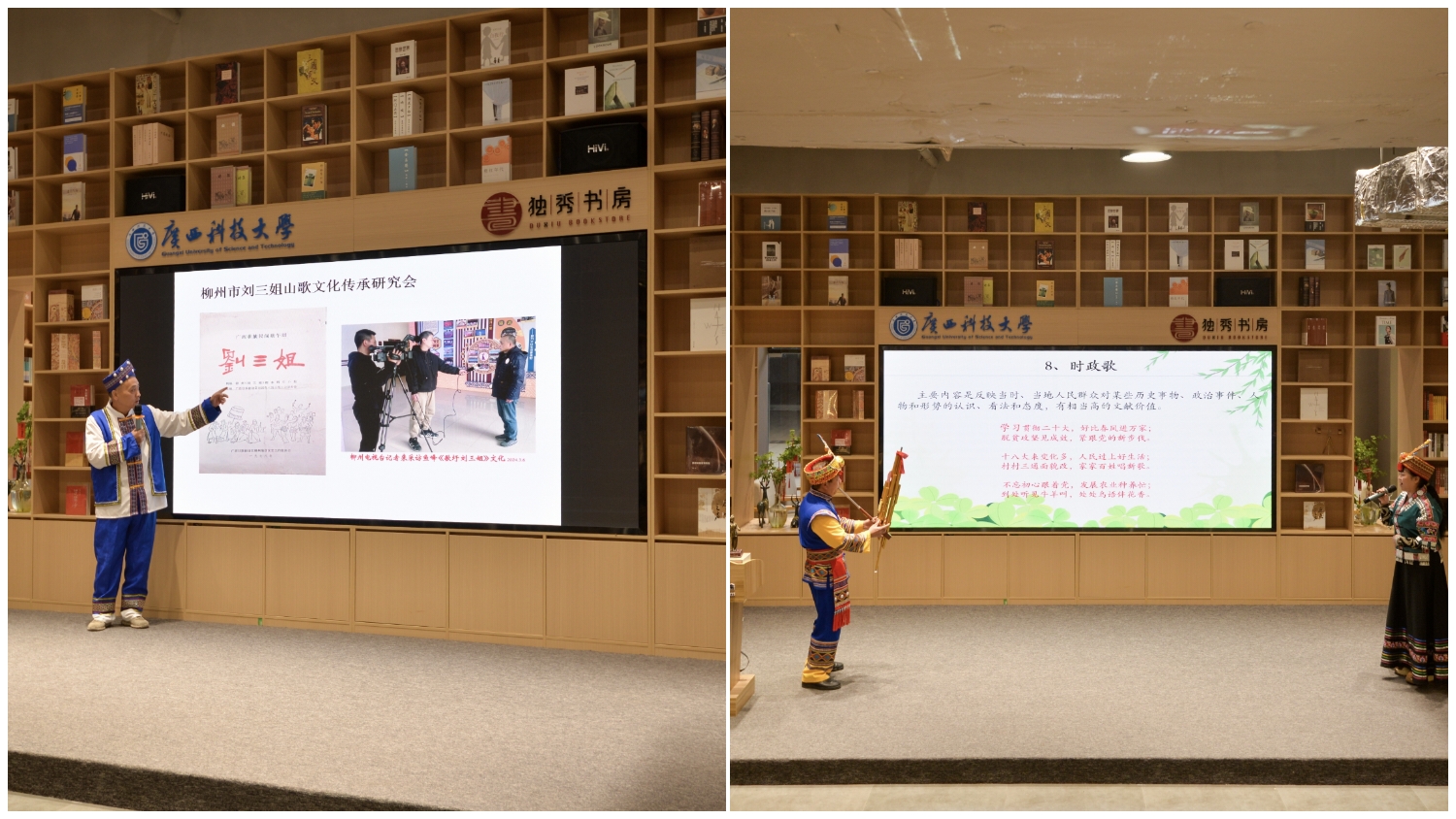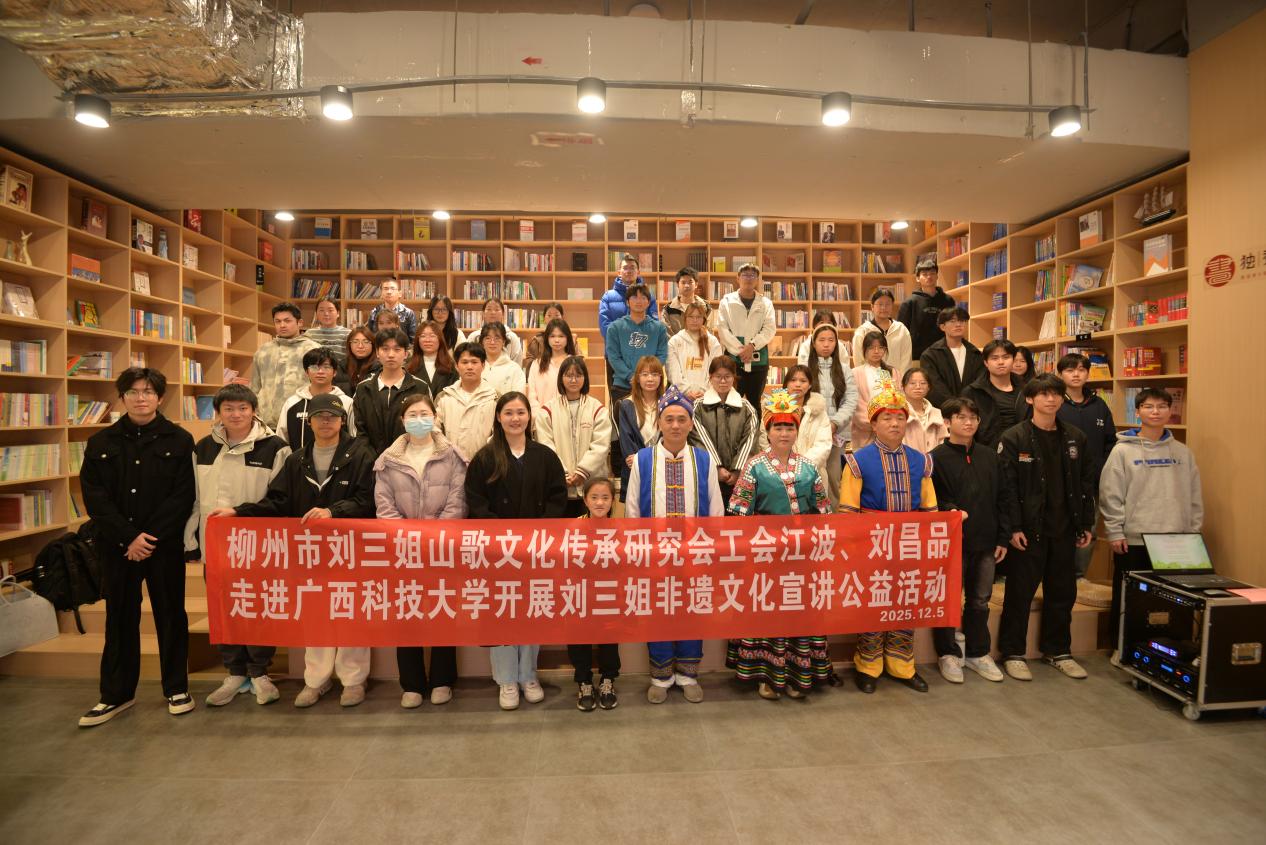 活动特邀柳州市刘三姐山歌文化传承研究会会长江波、副会长刘昌品作专题讲座。江波以《歌仙刘三姐与构筑中华民族共有精神家园》为题,讲述了刘三姐传说的来龙去脉,深刻阐释其在凝聚民族情感、构筑精神家园方面的重要意义。刘昌品则围绕《广西山歌七特性》展开分享,他不仅用生动语言和鲜活案例剖析山歌的独特魅力,还与现场一名老师合作演唱,以原汁原味的山歌演绎,让师生们直观感受非物质文化遗产的强大感染力。