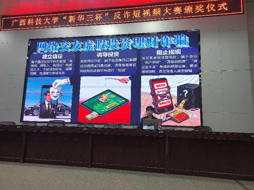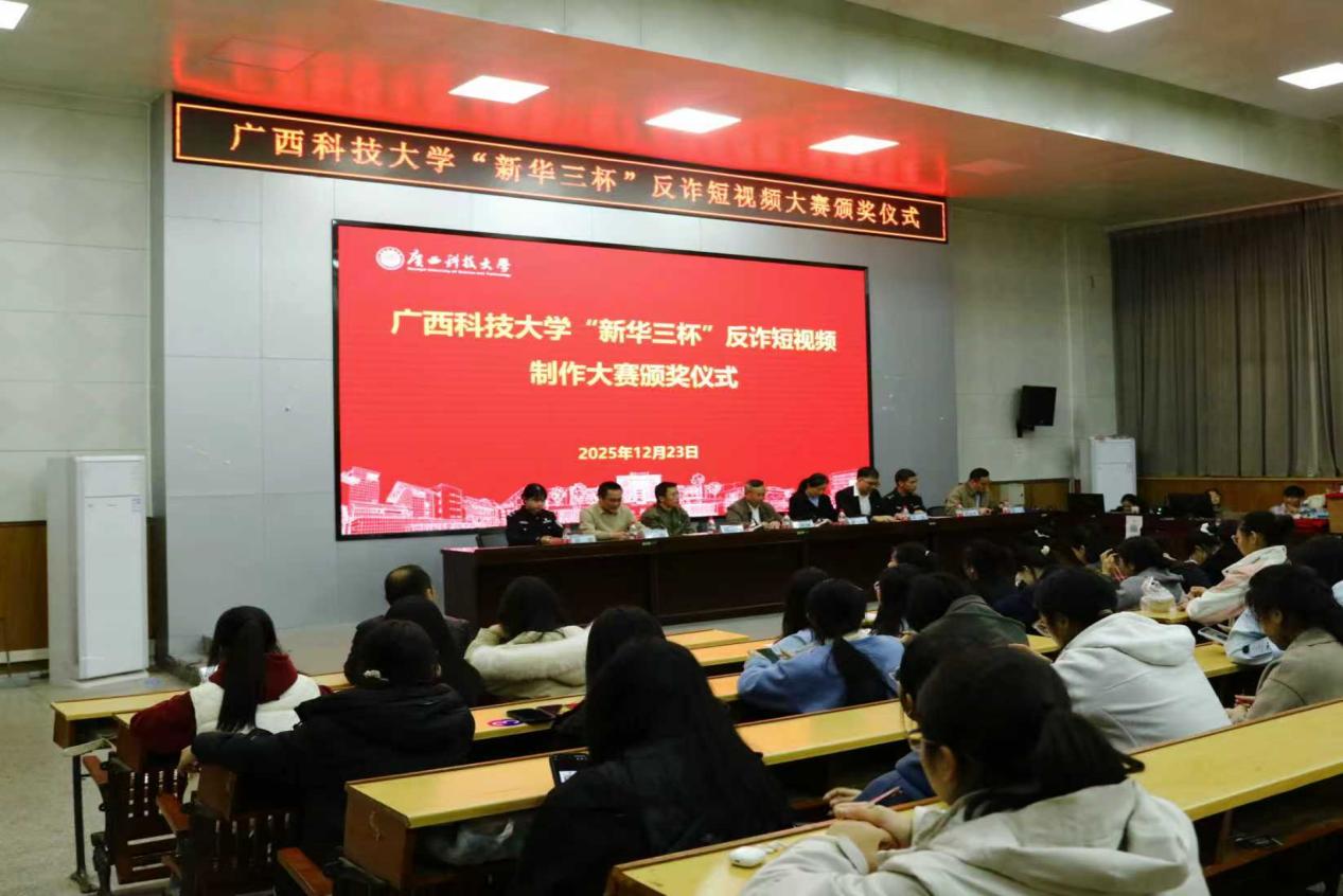 12月23日,广西科技大学“新华三杯”反诈短视频制作大赛颁奖仪式在文昌校区图书馆报告厅举行。武装部(保卫处)、学工部(处)、研工部(院)相关负责人,赞助企业代表,柳州市公安局潭中派出所、柳东派出所民警,参赛学院(部)教师代表及获奖学生参加仪式。