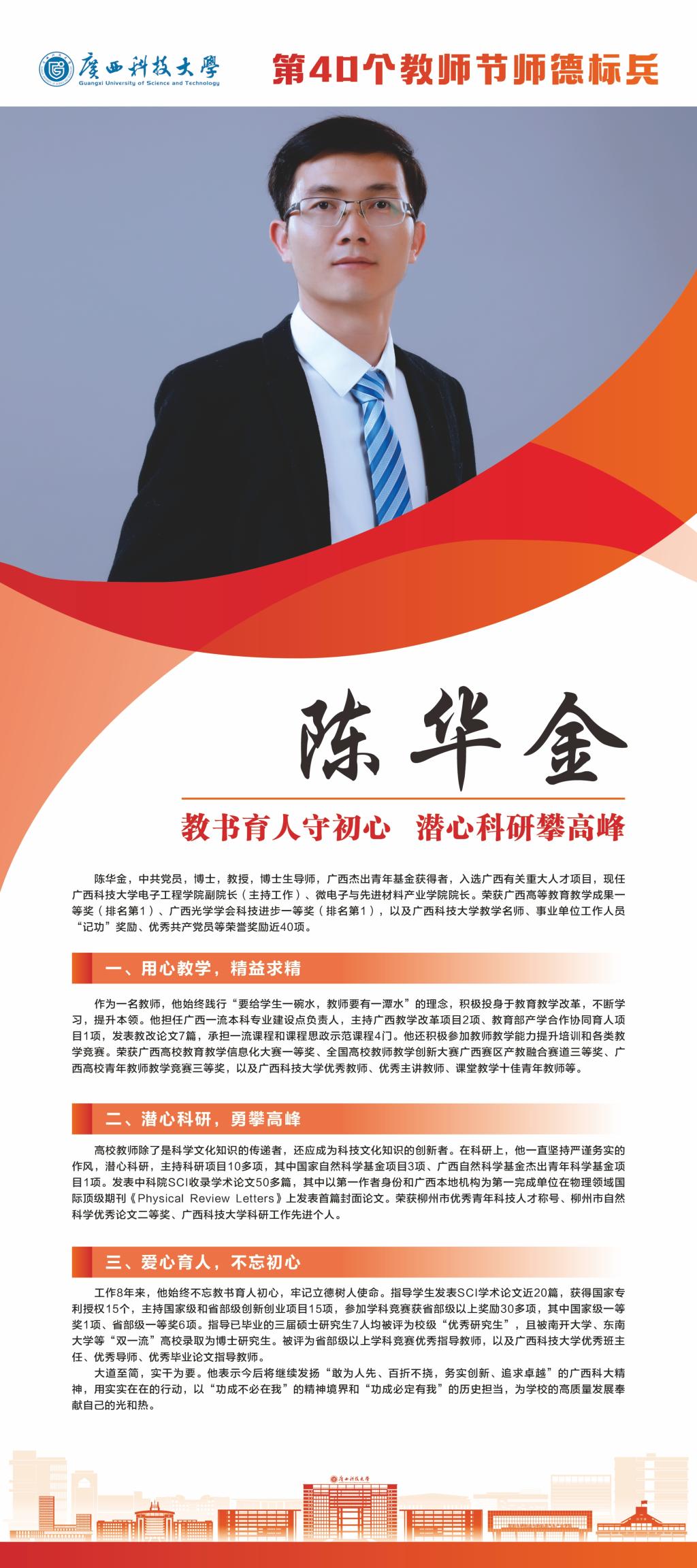 接下来,我们将推出系列报道,为大家介绍我校这些优秀教师。今天就让我们一起走近学校“师德标兵”陈华金吧。