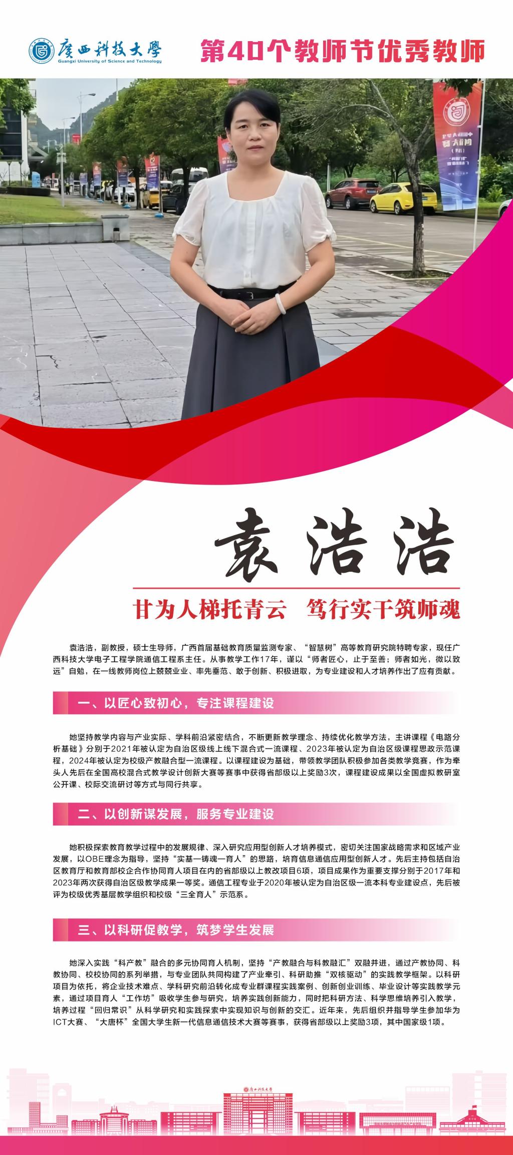 值我国第40个教师节来临之际,为全面贯彻新时代党的教育方针,落实立德树人根本任务,大力弘扬教育家精神,激励全校教职工爱岗敬业、锐意进取,不断提升教育教学和管理服务水平,营造尊师重教良好风尚,近日,学校评选并表彰了一批第40个教师节师德标兵、优秀教师、优秀教育工作者、优秀辅导员。根据《中共广西科技大学委员会关于表彰第40个教师节师德标兵、优秀教师、优秀教育工作者、优秀辅导员的决定》(科大党发〔2024〕68号)精神,决定对蔡亮等10名师德标兵、郑伟光等10名优秀教师、卢志平等10名优秀教育工作者、王俊辉等8名优秀辅导员进行表彰。