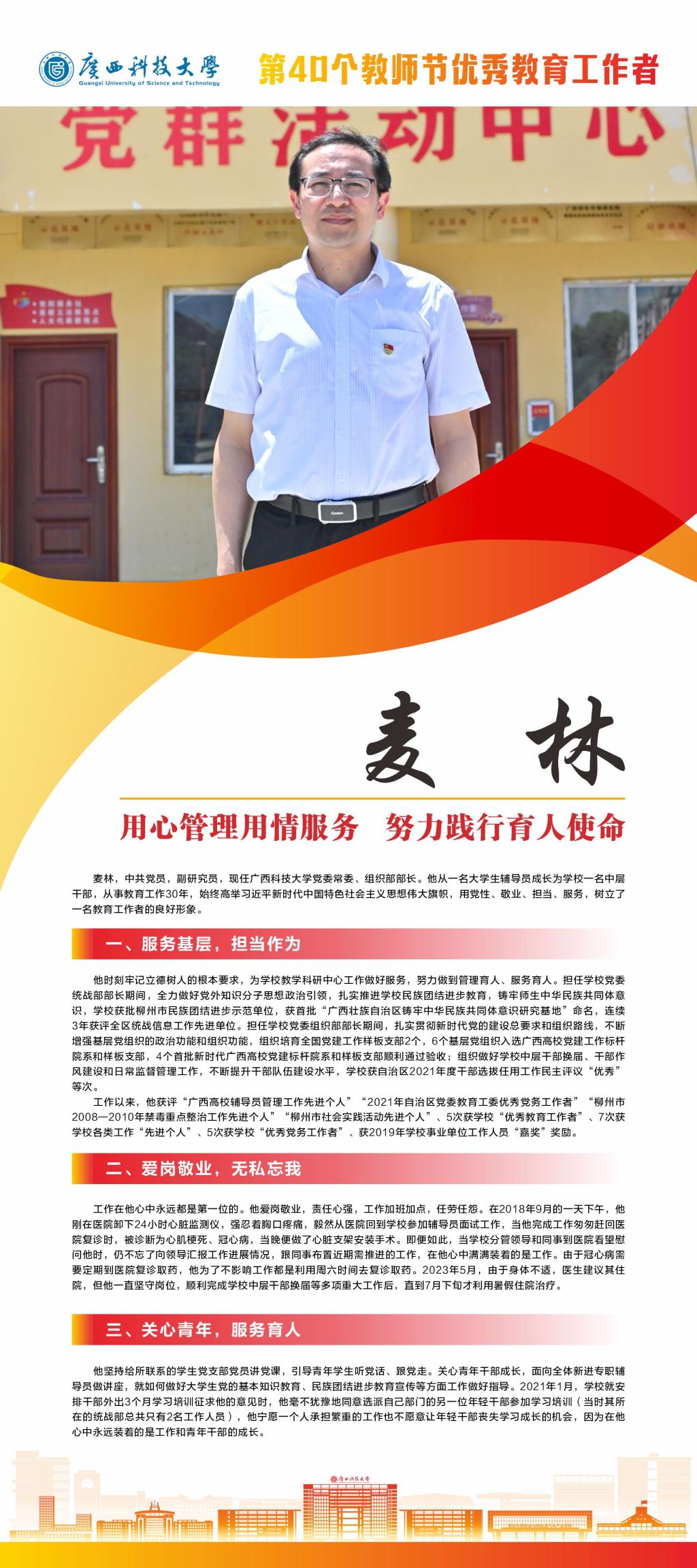 接下来,我们将推出系列报道,为大家介绍我校这些优秀教师。今天就让我们一起走近学校“优秀教育工作者”麦林吧。