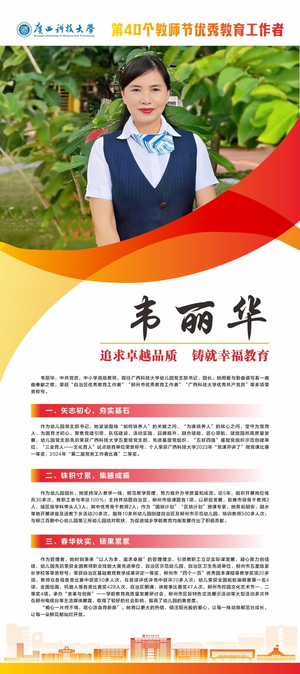 接下来,我们将推出系列报道,为大家介绍我校这些优秀教师。今天就让我们一起走近学校“优秀教育工作者”韦丽华吧。