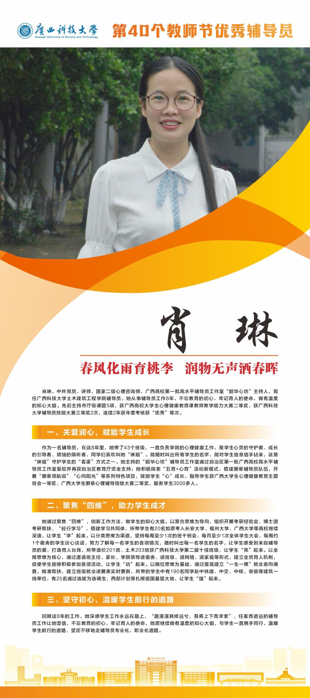 接下来,我们将推出系列报道,为大家介绍我校这些优秀教师。今天就让我们一起走近学校“优秀辅导员”肖琳吧。