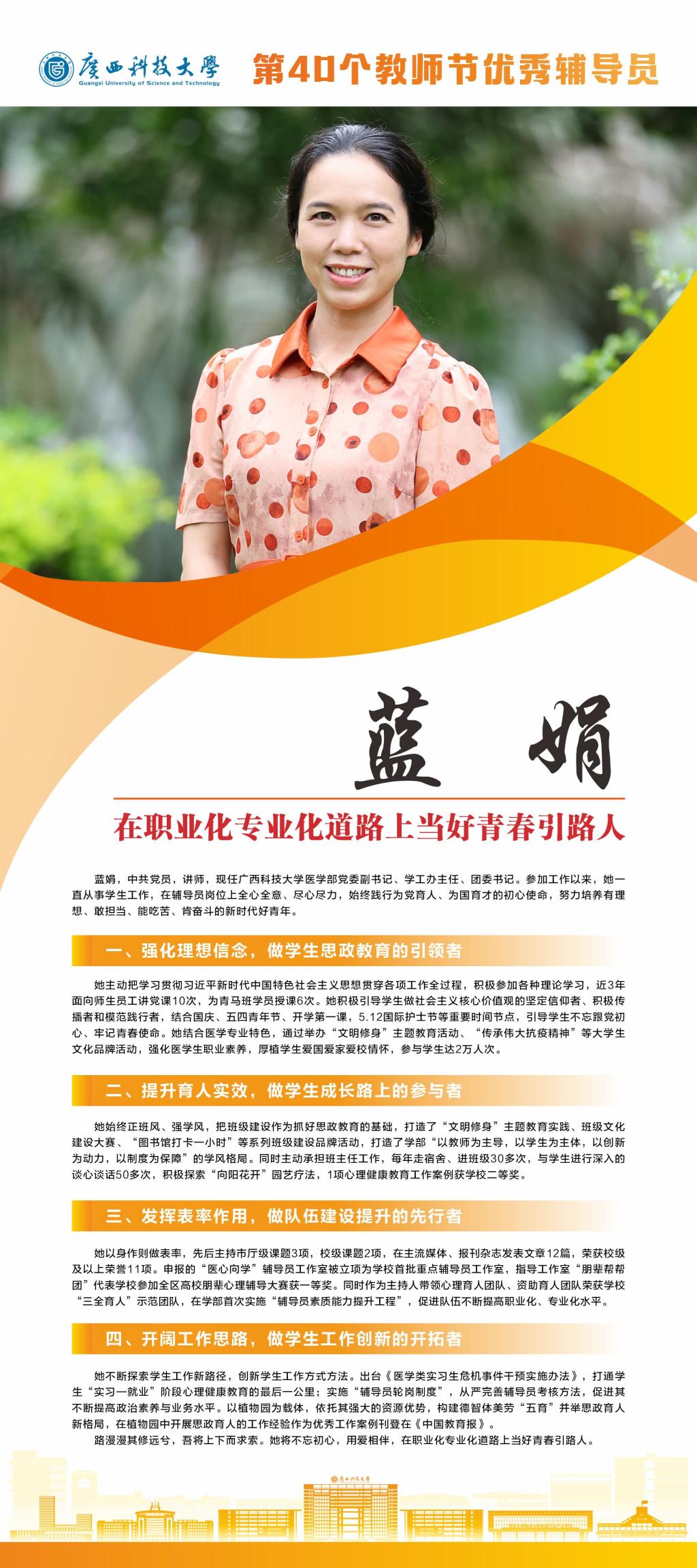 接下来,我们将推出系列报道,为大家介绍我校这些优秀教师。今天就让我们一起走近学校“优秀辅导员”蓝娟吧。