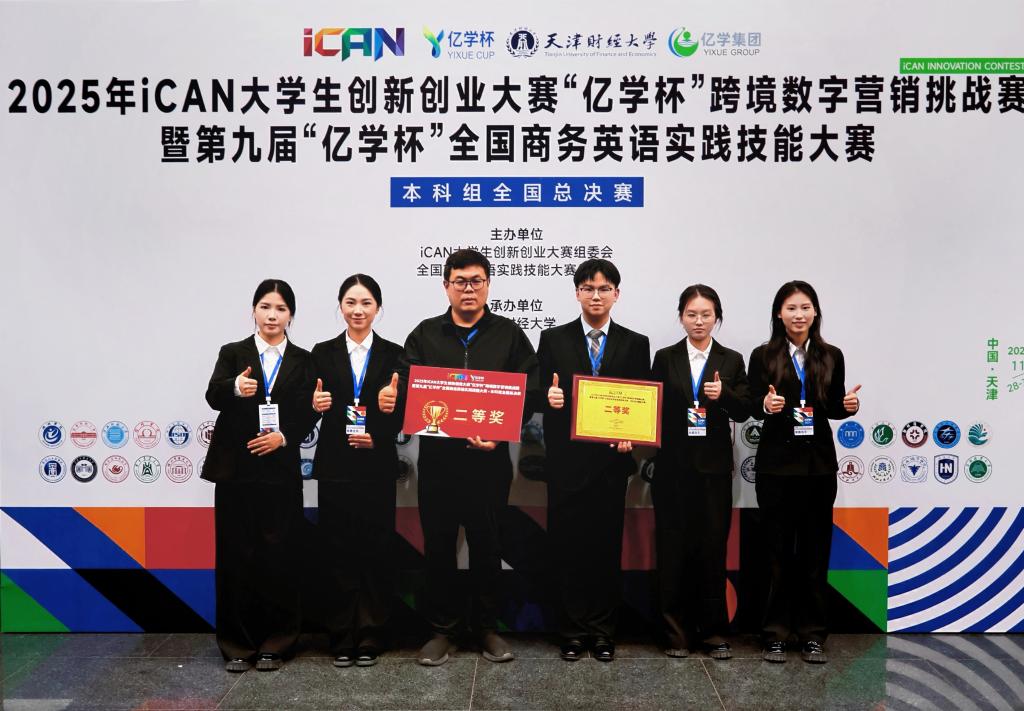 近日,ican大学生创新创业大赛“亿学杯”跨境数字营销挑战赛全国总决赛暨第九届“亿学杯”全国商务英语实践技能大赛总决赛在天津财经大学圆满举行。在外国语学院谭玮、周照兴、蔡恒老师的指导下,由英语专业学生孙昌雄、赵莹盈、赵静茹、谌虹伊、雷梦娇组成的团队荣获全国总决赛二等奖。