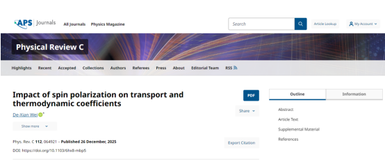 近日,理学院韦德贤博士在核物理领域国际知名期刊physical review c(中科院一区)发表了qcd相变及物态性质方面的最新研究论文"impact of spin polarization on transport and thermodynamic coefficients",我校为第一单位。