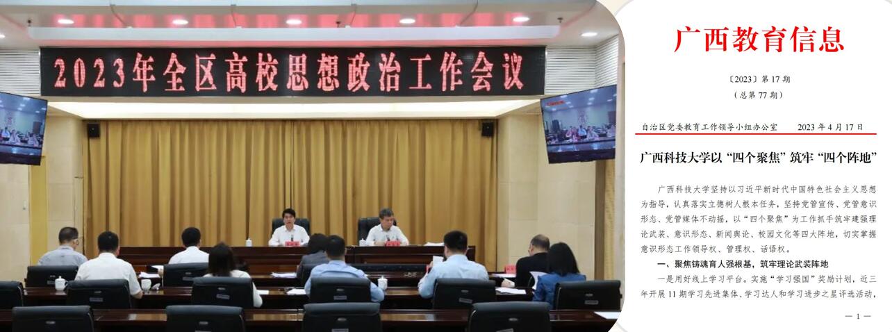 学校宣传思想文化工作—《以“四个聚焦”建强“四个阵地”》在2023年全区高校思想政治工作会议上作经验交流,并获《广西教育信息》刊登
