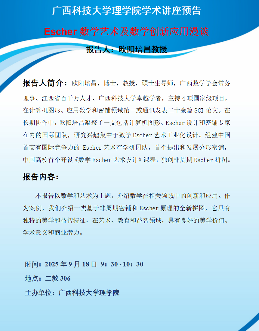 【学术讲座预告】理学院:escher数学艺术及数学创新应用漫谈